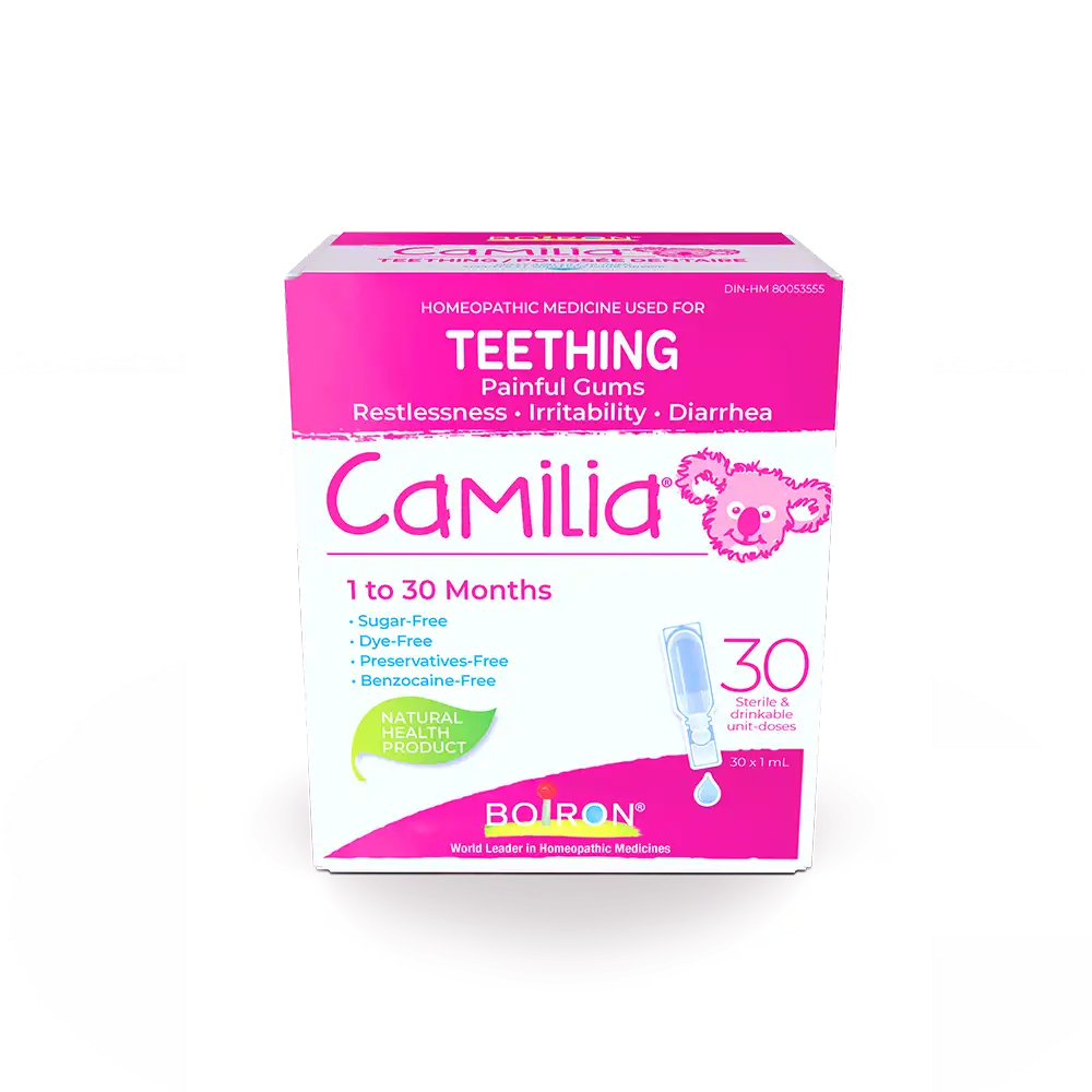 Homeopathic medicine used to relieve pain, restlessness, irritability and diarrhea due to teething.Developed specifically for babies and toddlers aged 1 to 30 months, Camilia is formulated in a sterile water-based and does not contain sugar, dye, benzocaine or preservatives.